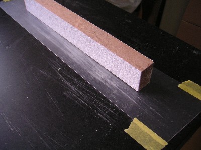 切り出す前に養生テープで養生します。これなら仕上げ面を下にして作業しても大丈夫。 これがない前縁部を削る際には傷だらけになります。 |