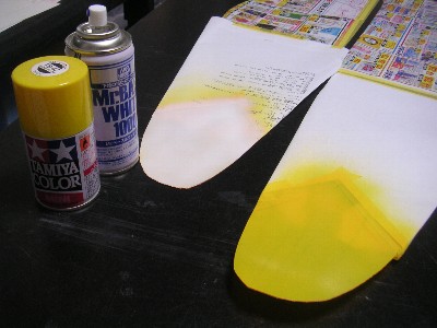 バギングプレートの翼端を転写するために着色します。 翼端が目立つようにするのはとても重要なポイントです。うまい人のフライトスタイルを観察すると必ずと言ってよいほど広いエリアを使用してフライトしています。 機体を遠くに出しても姿勢を見誤らない様に視認性を高めることは非常に重要です。視認性を高めるためには蛍光色を用いるケースが多いですが、もうひとつの方法は”コントラスト”を強くすること。カーボンの黒にヴィヴィッドなカラーリングをすることでも視認性があがります。 カーボンに転写する際、着色スプレーを吹いたあとに”ベースホワイト”を吹くことで下地隠蔽性があがります(写真左)。隠蔽性を上げる為に厚塗りするよりは有効な方法です。 |