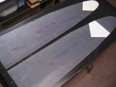 養生が終わったら、主翼のテンプレートを用いて、バギングプレートを切り出します。 |